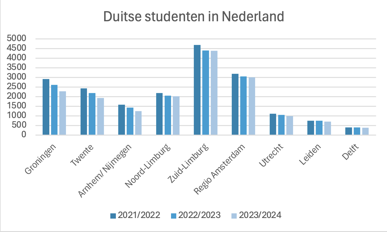 Eerder dit jaar bleek al dat het aantal Duitse studenten in Nederland terugloopt. In 2020/2021 telde Nederland bijna 25.000 Duitse studenten, in 2023/2024 waren dat er nog maar 20.000.