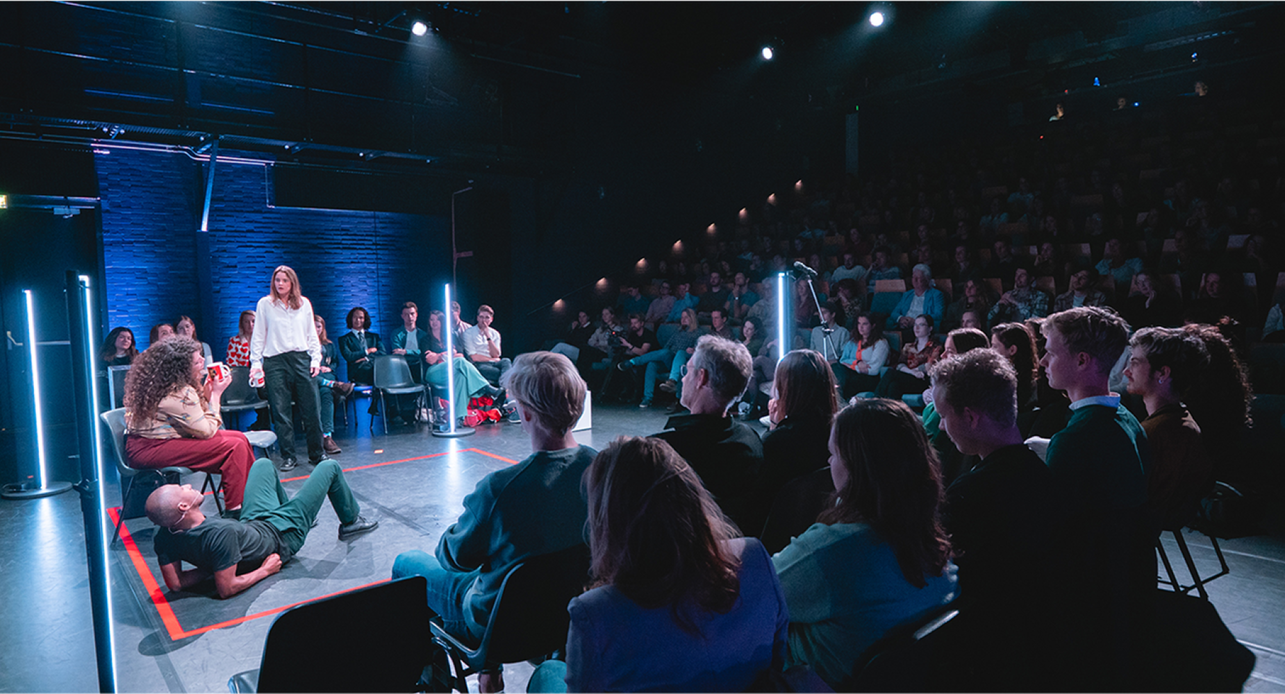 Voordat de bezoekers allemaal plaatsnemen, wordt de eerste vraag op een scherm geprojecteerd. Welke onderwerpen bespreek je liever niet om het gezellig te houden? De antwoordopties ‘politiek’ en ‘religie’ steken er met kop en schouders bovenuit. De gastvrije jongeren blijken Sarah, Puck en Moes te zijn, die de voorstelling samen met ‘docent’ Arnoud introduceren. Met felrode tape wordt de safe space letterlijk op het podium afgetekend. Een plek waar je alles mag zeggen en anderen niet mogen oordelen. Docent Arnoud, die een ‘typische’ man van middelbare leeftijd blijkt, is daar blij mee. Hij heeft het idee dat hij “tegenwoordig niets meer mag zeggen”, klaagt hij.