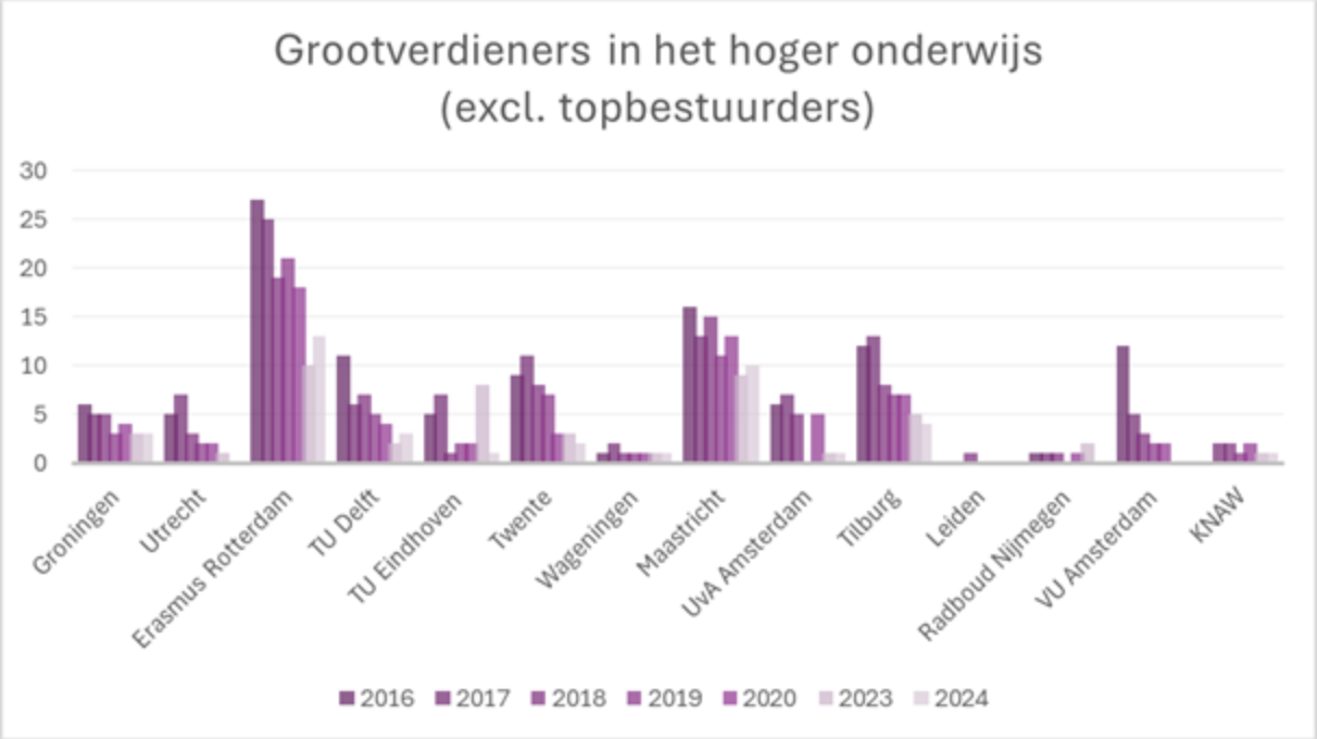 Uit een analyse van de cijfers van DUO blijkt dat het aantal grootverdieners in het hoger onderwijs de afgelopen jaren fors is teruggelopen. Volgens de oudst beschikbare cijfers waren er in 2016 nog 112 niet-bestuurders met een salaris boven de norm. In 2020 waren dit er 64 en vier jaar later 39.