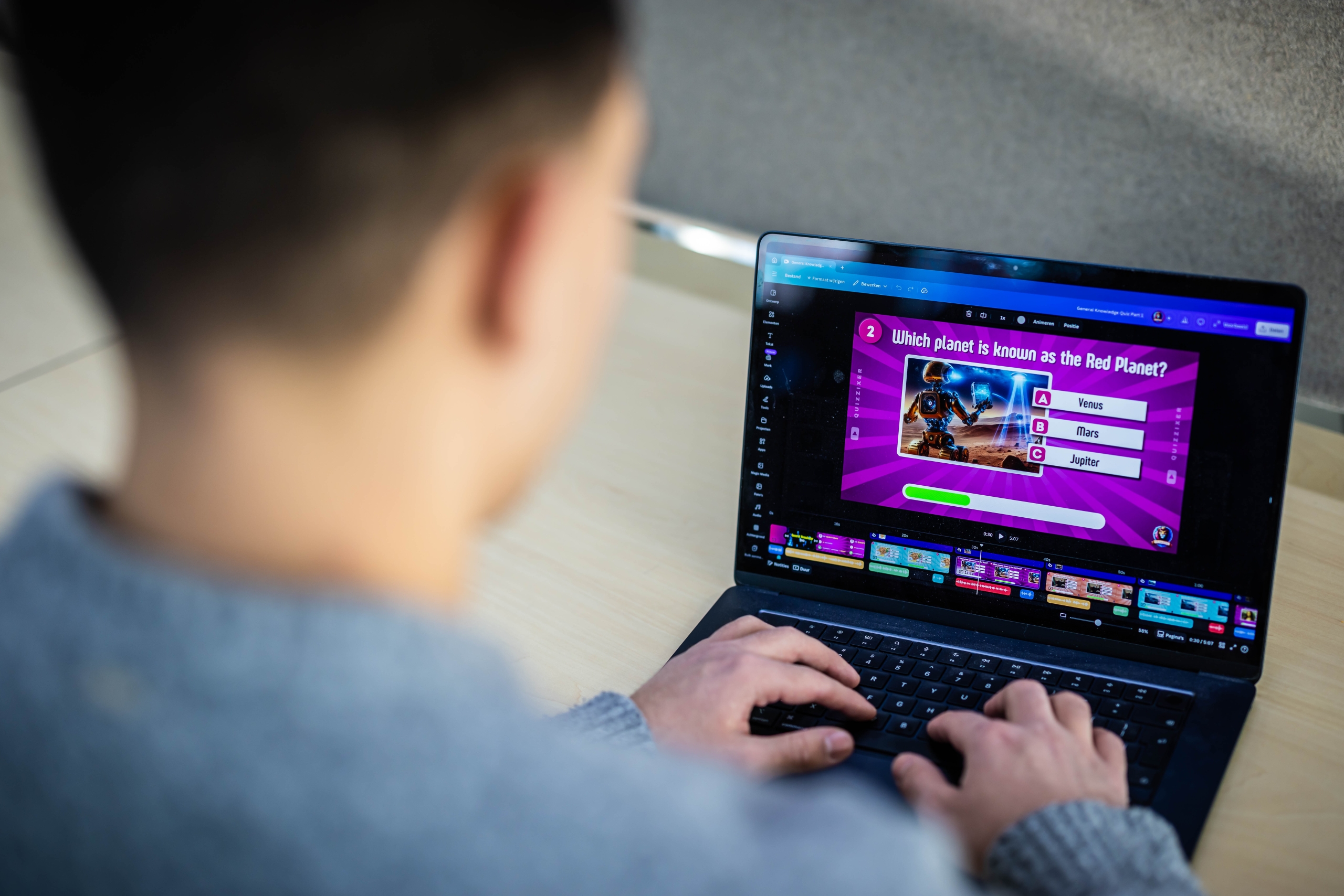 Daarnaast heb ik vorig jaar voor de landelijke hbo-studentenwedstrijd ‘Jij powered by AI’ een video over ondernemerschap in het AI-tijdperk gemaakt. Met behulp van de platforms Nfinity.AI en Canva. Het leverde me een plekje op bij de laatste tien van die competitie.”