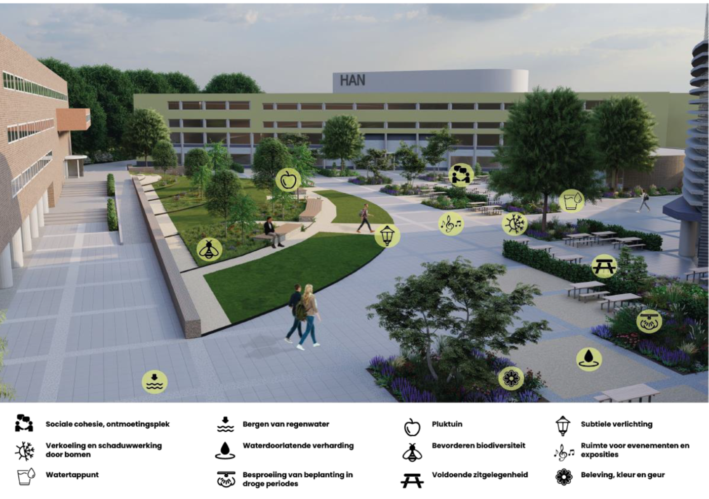“Fast forward naar oktober 2025. Het hele voortraject is inmiddels afgerond en het CvB heeft groen licht gegeven voor de uitvoering. Kortom, de handen kunnen uit de mouwen. Vanaf deze week starten de herinrichtingswerkzaamheden, onder regie van de afdeling Huisvesting. Loop je de komende tijd over het campusplein tussen de HAN-gebouwen Ruitenberglaan 27, 29 en 31, dan zal het je vast niet ontgaan.